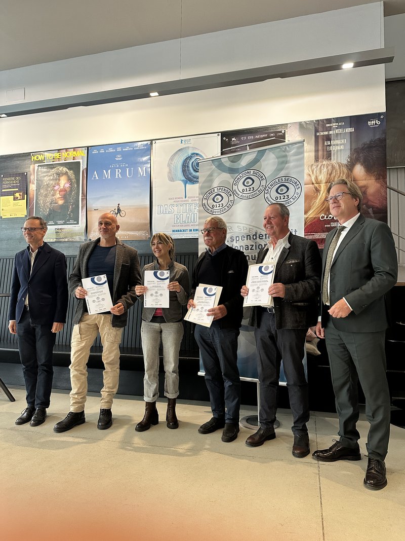 Von links nach rechts:Günther Sommia, Geschäftsführer des Dachverbandes für Soziales und Gesundheit Reinhold Weger, Präsident des Vereins Friedensbrücken Neumarkt, Vertreterin des Jugenddienst Meran KDS, Georg Mayr Präsident des Vereins Freiwillige Arbeitseinsätze KDS