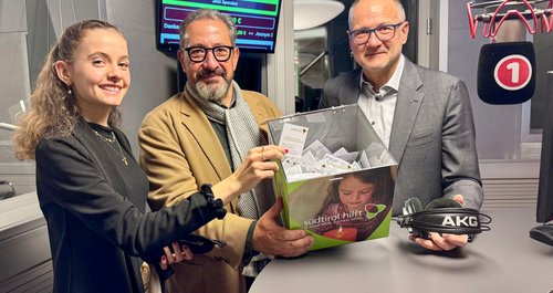 Die heurige Ziehung der Südtirol hilft Lotterie auf Südtirol 1 und Radio Tirol mit Moderatorin Anna Schwienbacher als Glücksfee, Südtirol hilft Präsident Heiner Feuer und Ziehungsbeauftragten Dieter Plaschke (vlnr)